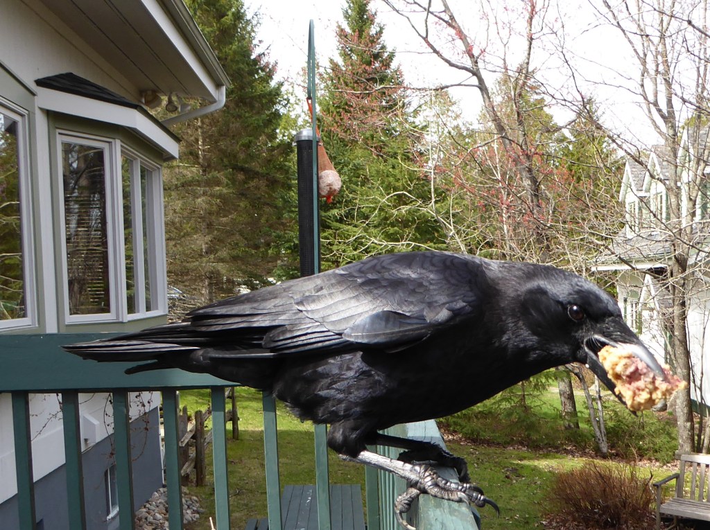Votre corneille d’Amérique de la famille des corvidés affectueusement surnommée la Comtesse fait partie du décor. Elle est même garante du territoire. De plus, elle garde un œil sombre sur le geai bleu aussi de la famille des corvidés qui se gave d’arachides en écailles, rien de moins, courtoisie de la dame de la maison (vous).
